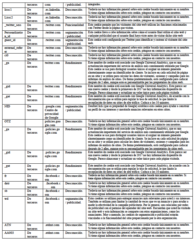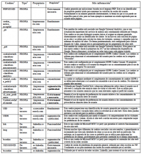 Nota: Las cookies de tipo “Propias” son utilizadas sólo por el propietario de esta web y las cookies “De terceros” son utilizadas, también, por el prestador del servicio que está detallado en el cuadro anterior.